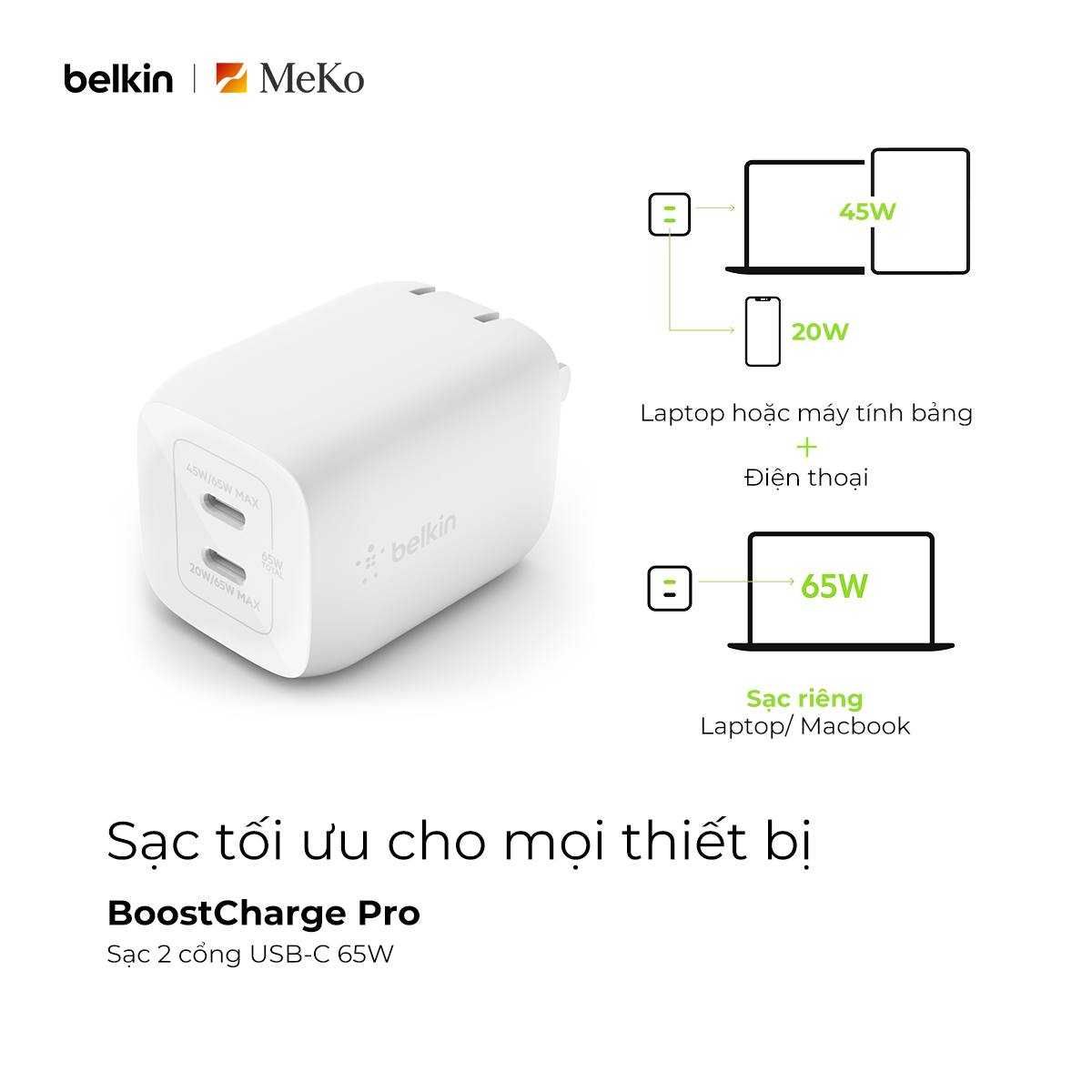 Sạc nhanh BOOSTCHARGE PRO GaN Belkin 65W - 2 cổng USB-C PD 3.0 PPS